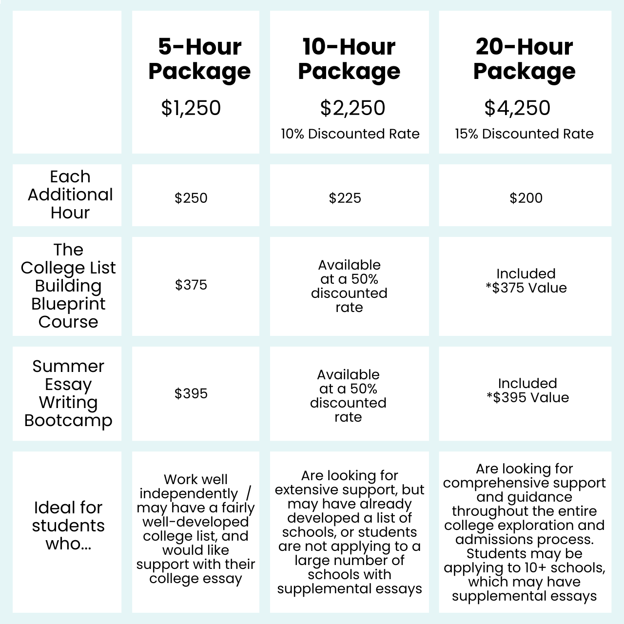 Guidance and support throughout the entire essay writing process. Essay support is provided through a combination of one-on-one sessions and Google Doc collaboration.